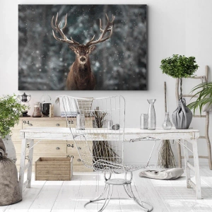 - A festmény egy fenséges szarvast ábrázol, amint egy hófödte erdőben áll. A hulló hó téli hangulatot és harmóniát kölcsönöz a kompozíciónak, így kiváló választás hangulatos belső terekbe.