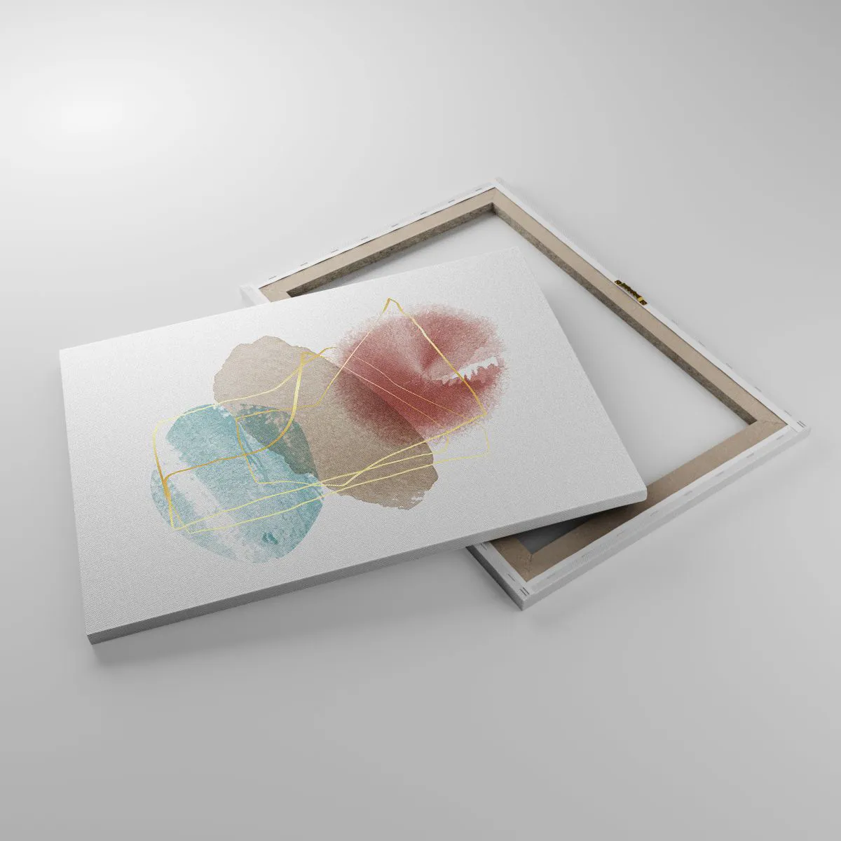 - Pasztellszínű absztrakt formákat és arany vonalakat ábrázoló festmény. Minimalista és elegáns kompozíció, amely tökéletes modern és kifinomult enteriőrökbe.