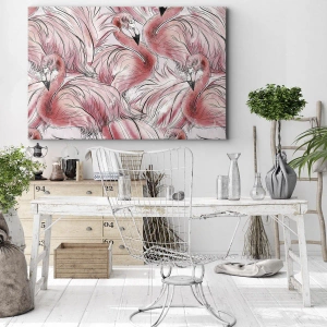 • Ez a festmény rózsaszín flamingók finom rajzait ábrázolja trópusi környezetben. Tökéletes dekoráció, amely bármilyen belső térbe finomságot és egzotikus hangulatot kölcsönöz.