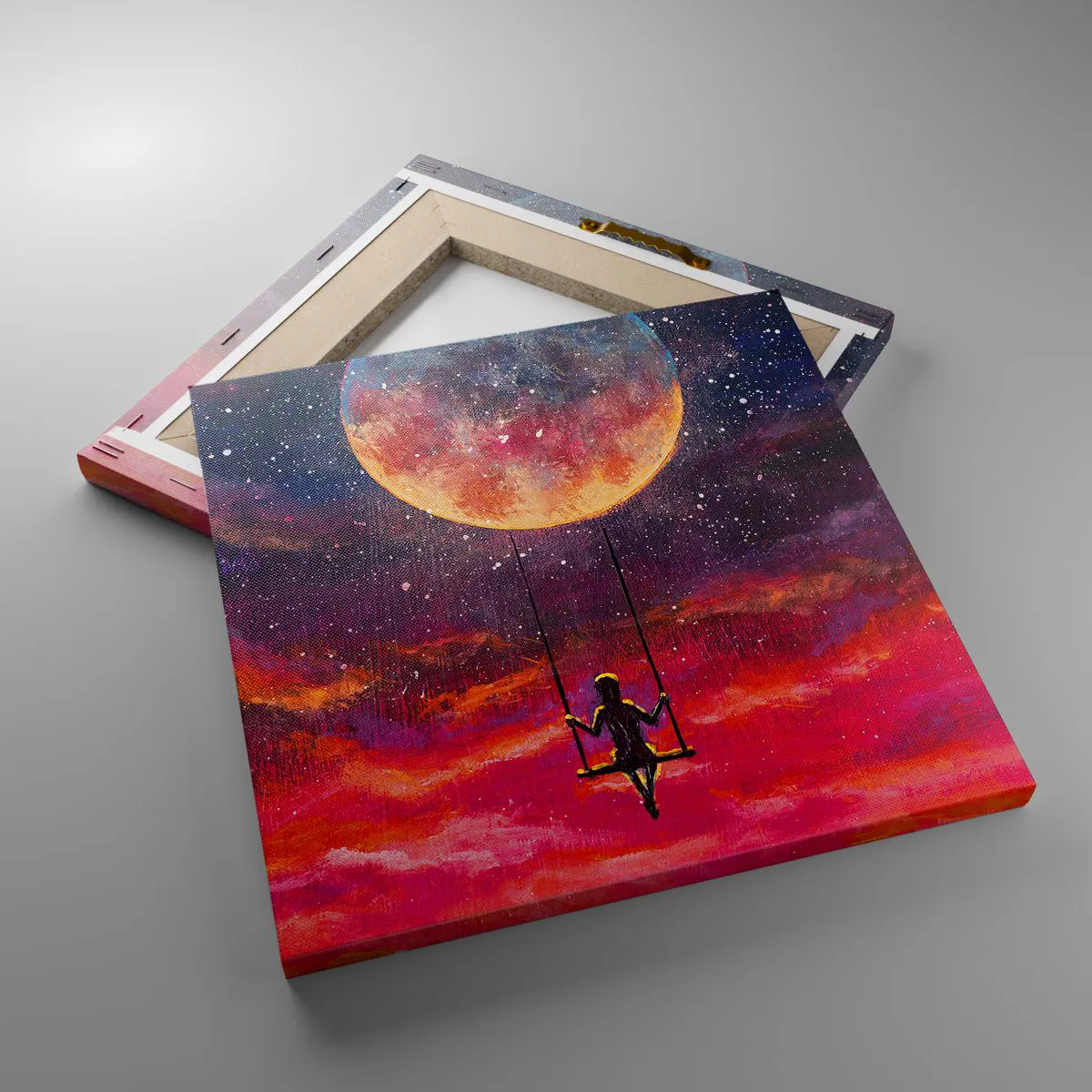 A vászon a keretre van feszítve. Az oldalak és a szélek nyomtatva vannak, a kép folytatását alkotva. A kép készen áll a falra akasztásra. Minden termékhez tartozik egy, a kerethez rögzített akasztó és egy rögzítőkészlet (csavar + dübel).