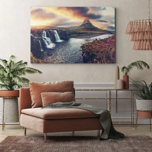 Vászonkép - Kilátás a vízesésre és a hegyre a lenyugvó nap fényében - 70x50cm - A természet fenségében - Modern fali dekoráció nappalihoz és hálószobához ARTTOR