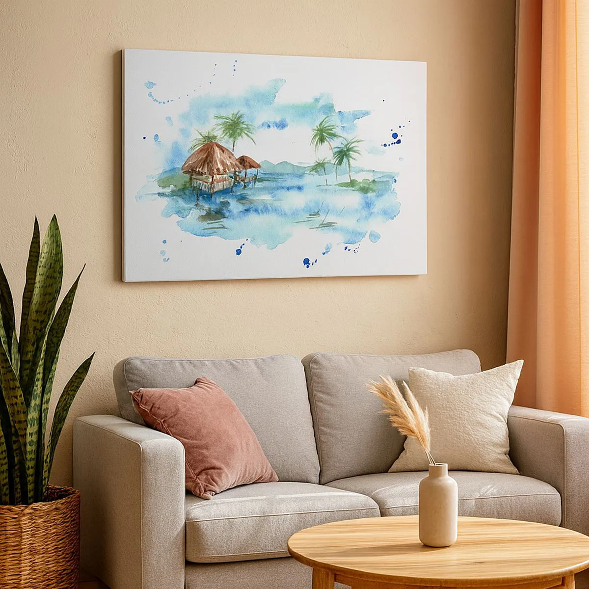 A vászon a keretre van feszítve. Az oldalak és a szélek nyomtatva vannak, a kép folytatását alkotva. A kép készen áll a falra akasztásra. Minden termékhez tartozik egy, a kerethez rögzített akasztó és egy rögzítőkészlet (csavar + dübel).