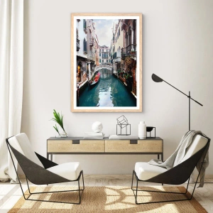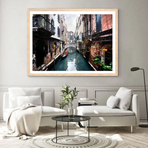 Poszter világos tölgy keretben - Velencei táj gondolával és híddal - 30x30 cm
