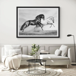 Poszter fehér keretben - Fekete-fehér lovak vágtatnak dinamikusan egy mező hátterében - 50x70cm - Angyalok és démonok - Modern fali dekoráció nappalihoz és hálószobához ARTTOR