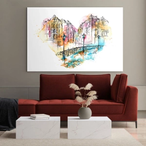 Üveg kép - Romantikus bérházak szív alakú híddal, akvarell - 70x50cm - A város szíve - Modern fali dekoráció nappalihoz és hálószobához ARTTOR