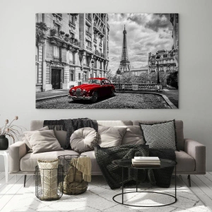 Üveg kép - Piros autó az Eiffel-torony előtt, fekete-fehér Párizsban - 70x50cm - Ragadozó a városban - Modern fali dekoráció nappalihoz és hálószobához ARTTOR