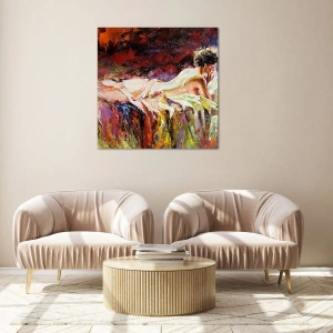 Üveg kép - Impresszionista női akt színes anyagon - 70x50cm - Töprengő Vénusz - Modern fali dekoráció nappalihoz és hálószobához ARTTOR