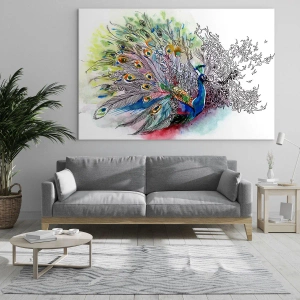 Üveg kép - Színes páva művészi akvarell stílusban - 70x50cm - Büszkeséggel a szürkeség ellen - Modern fali dekoráció nappalihoz és hálószobához ARTTOR
