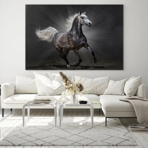 - Egy dinamikus festmény, amely egy vágtató lovat ábrázol sötét háttér előtt, fényeffektussal. Feltűnő kompozíció, amely ideális a modern enteriőrökbe.