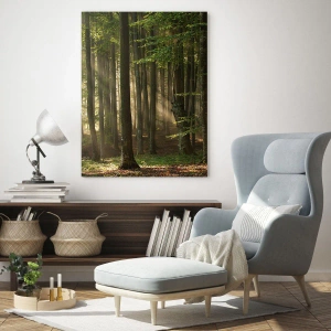 - festmény egy festői erdőt ábrázol, melyben a napfény átszűrődik a fákon. A természet és a finom fény harmóniája egyedi faldekorációt hoz létre, amely tökéletes a természetes stílusú enteriőrökbe.