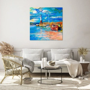 Üveg kép - Szivárvány-öböl világítótoronnyal és színes hajókkal a kikötőben - 70x50cm - Egy délután a szivárványos öbölben - Modern fali dekoráció nappalihoz és hálószobához ARTTOR