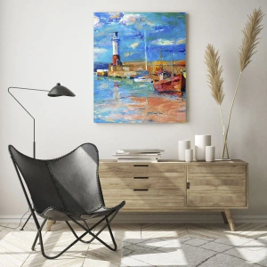 - A festmény egy szivárványszínű öblöt ábrázol világítótoronnyal és színes hajókkal. Hangulatos tájkép, amely tökéletes egy nappaliba vagy irodába.