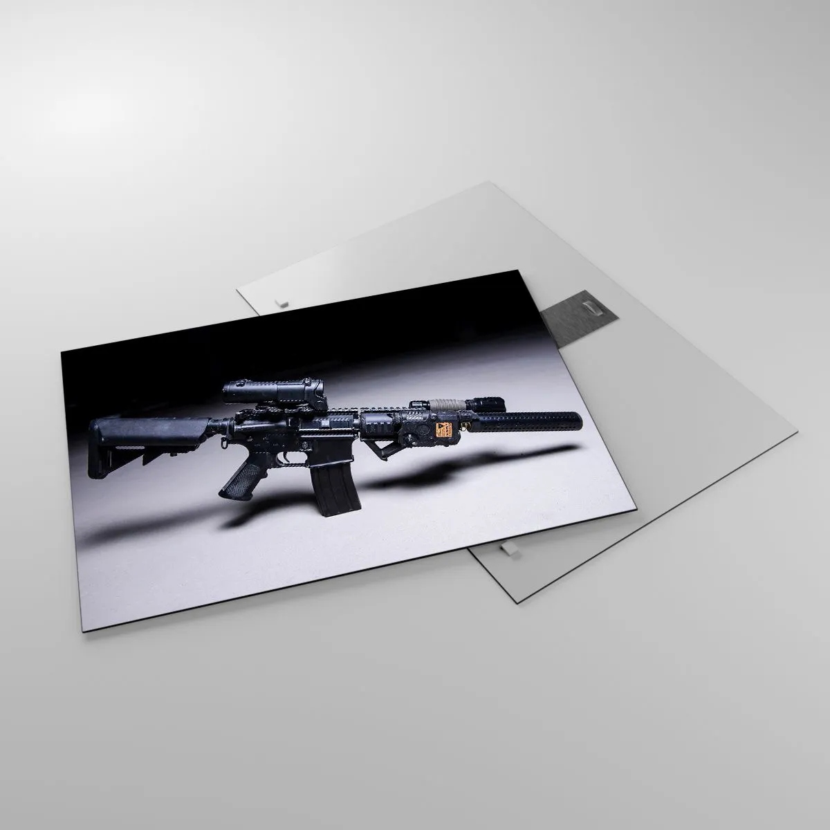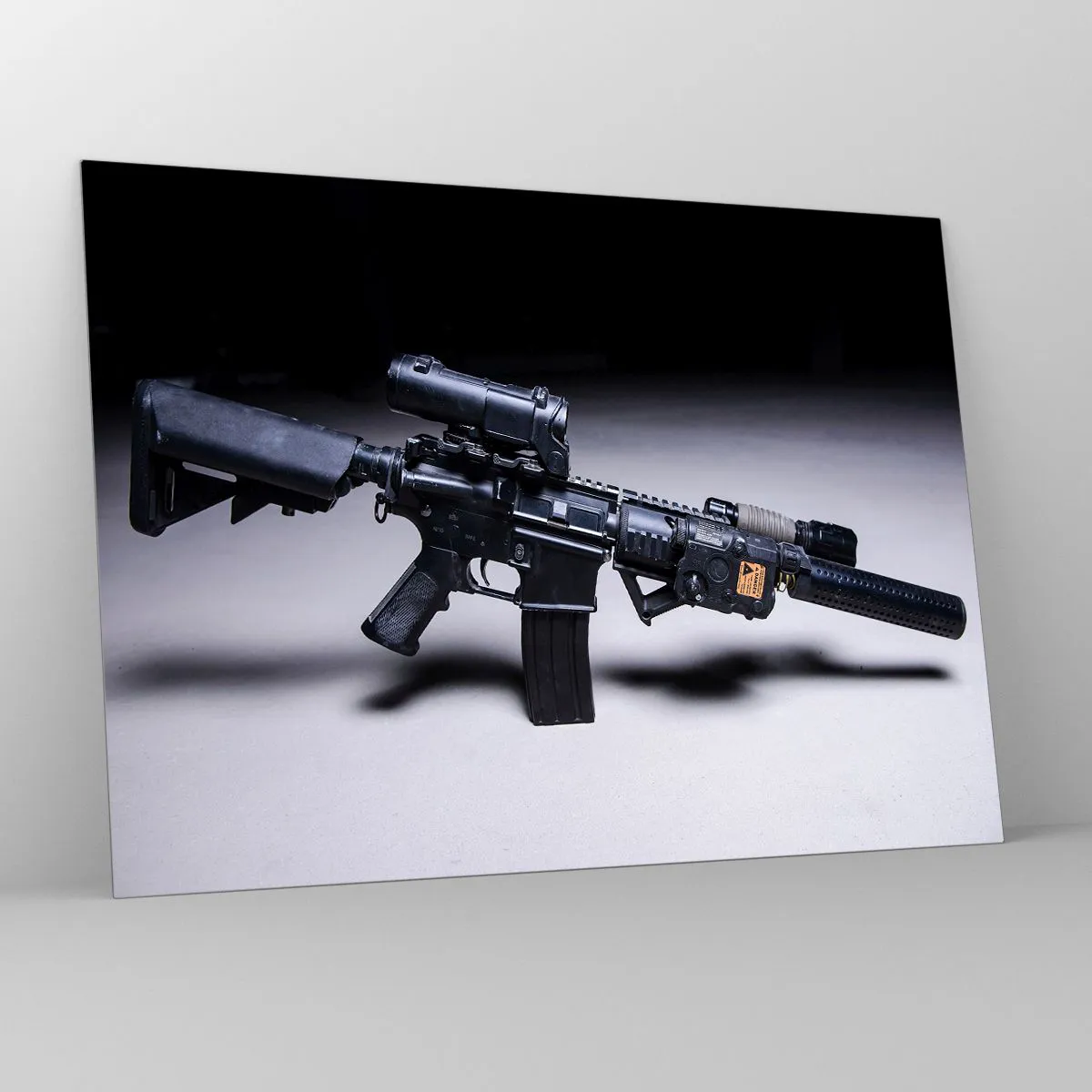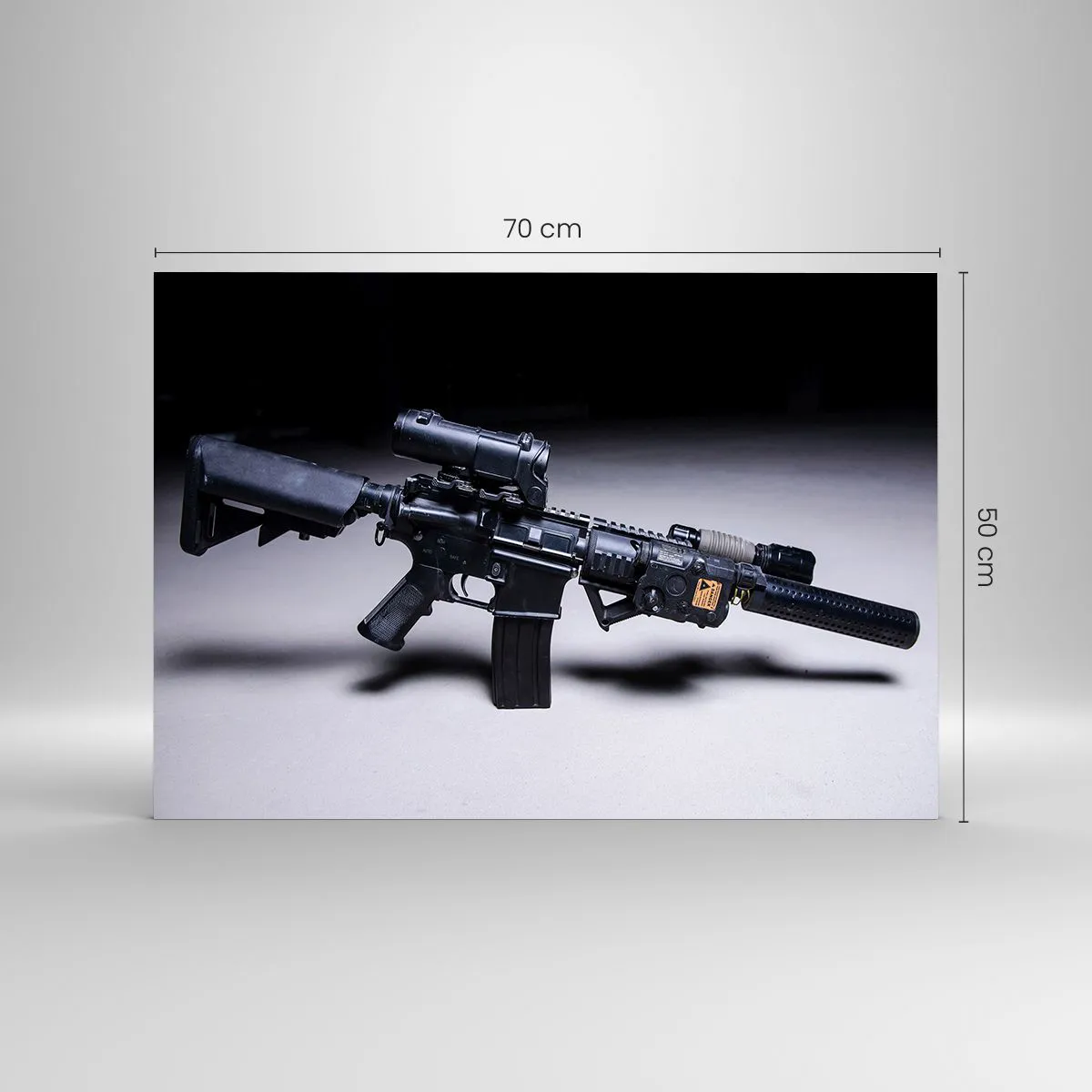 Üveg kép - Egy fekete gépkarabély tartozékokkal, világos háttér előtt feküdt - 70x50cm - Sötét lovag - Modern fali dekoráció nappalihoz és hálószobához ARTTOR