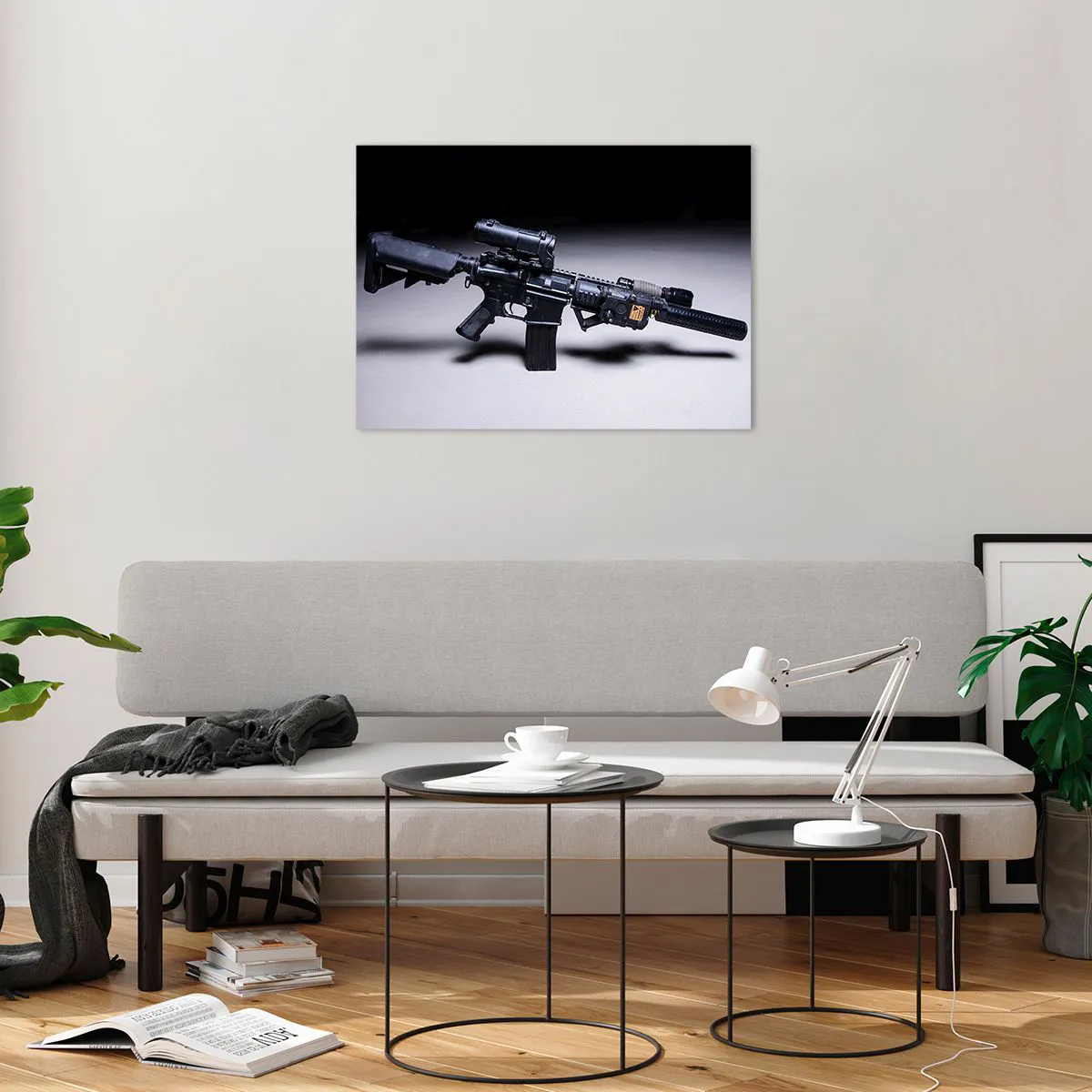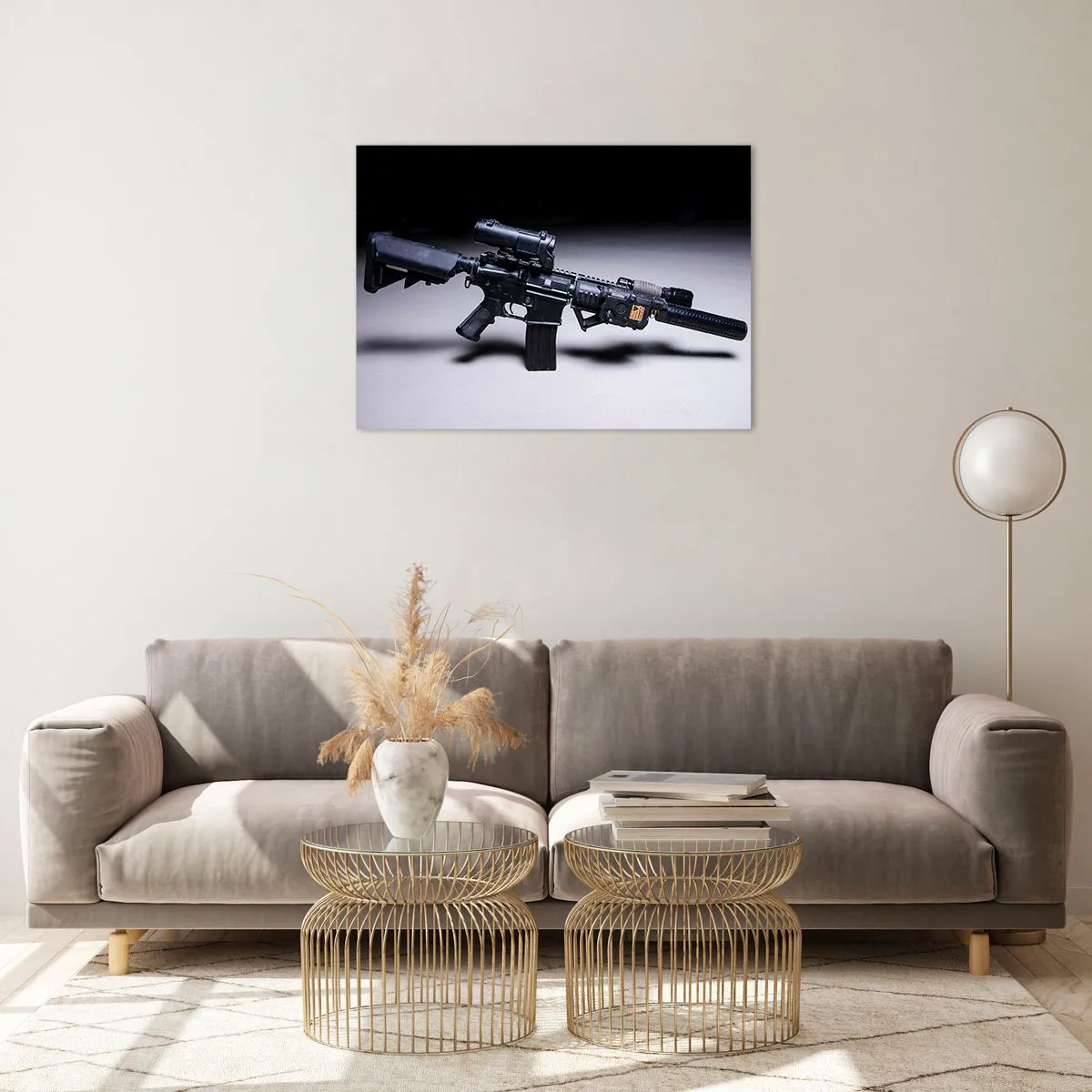 A Fekete Gépkarabély egy egyedi festmény, amely a modern fegyverek erejét és pontosságát ábrázolja. A Világos háttér előtt fekvő puska fejlett kiegészítőkkel van felszerelve, mint például hangtompító és optika, ami professzionális jelleget kölcsönöz neki. Minden részletet rendkívüli gondossággal rögzítettek, így ideális a katonai tárgyak és a modern katonai technológia szerelmeseinek.