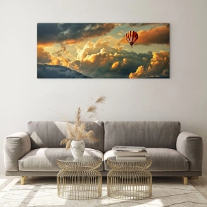 - Ez a rendkívüli festmény egy hőlégballont ábrázol, amint a hegyek felett lebeg a felhők között, a lenyugvó nap aranyló fényében. Tökéletes dekoráció a kalandvágyók számára.