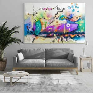 - A 70x50 cm-es festmény egy élénk színekkel, geometrikus formákkal és finom vonalakkal díszített absztrakt kompozíciót ábrázol, amely ideális dekoráció modern enteriőrökbe.