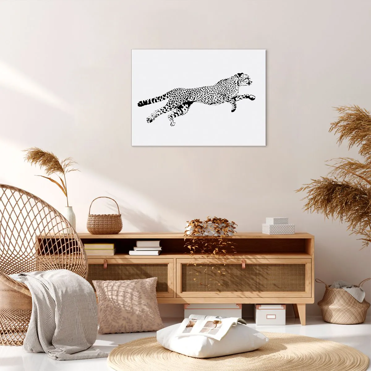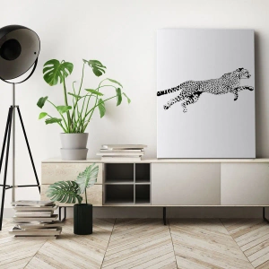 - Egy futó gepárd dinamikus grafikája, minimalista fekete-fehér stílusban. Tökéletes modern vagy természet ihlette enteriőrökbe.