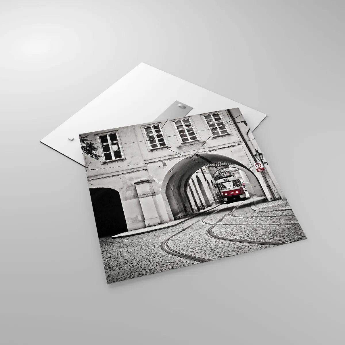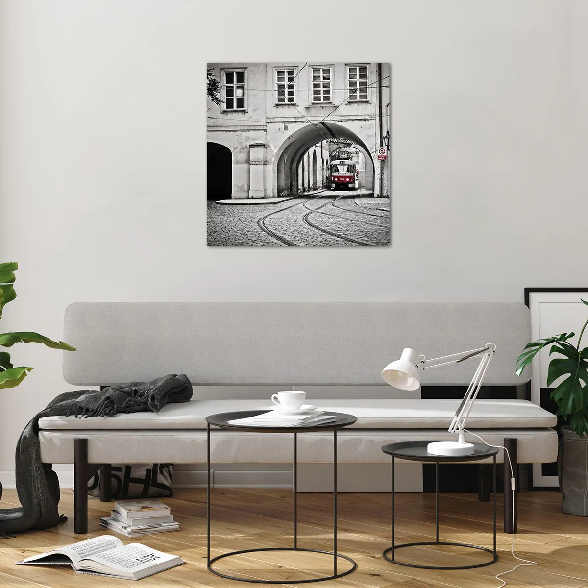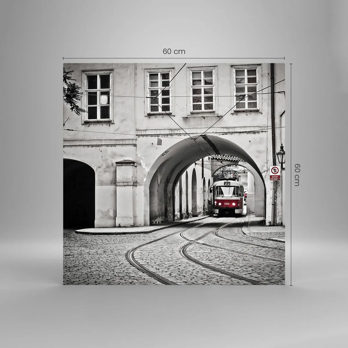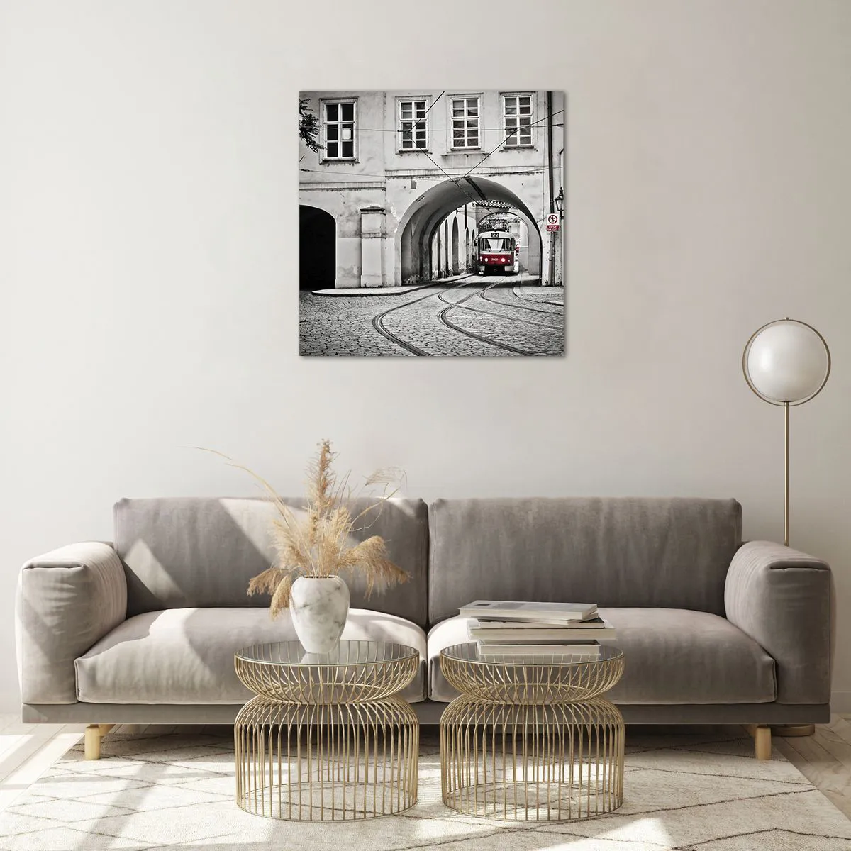 • Város, Villamos, Prága, Építészet, fekete-fehér, városok, autóipar, vintage és retro, Irodába, dolgozószobába, étkezőbe, előszobába, nappaliba, hálószobába, Szürke, fekete-fehér, Négyzetes