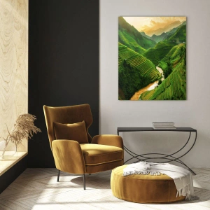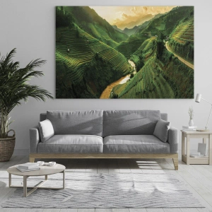 - A 70x50 cm-es üvegfestmény egy vietnami völgy festői rizsteraszait ábrázolja, amelyeket a lenyugvó nap aranyló sugarai fürdenek.
