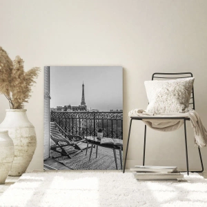 A Párizsi délután egy festmény, amely egy párizsi erkélyről nyíló romantikus kilátást ragad meg. A nyitott ajtón keresztül Párizs klasszikus építészetét látjuk, háttérben az Eiffel-toronnyal, elegáns erkélyek és teraszok között. Az előtérben egy asztal egy könyvvel és egy növénnyel békés hangulatot teremt, amely tökéletes a nyári napok pihenésére. A festmény általános fekete-fehér színei nosztalgikus hangulatot kölcsönöznek, kiemelve a párizsi látkép időtlen eleganciáját.