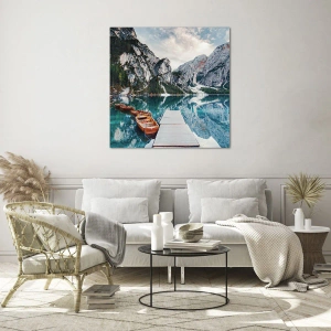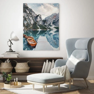 - Egy türkizkék tó, hegyekkel körülvéve, fából készült mólóval és csónakokkal. A táj tele van nyugalommal, tükröződésekkel és természetes harmóniával. Tökéletes dekoráció lélekkel teli belső terekhez.