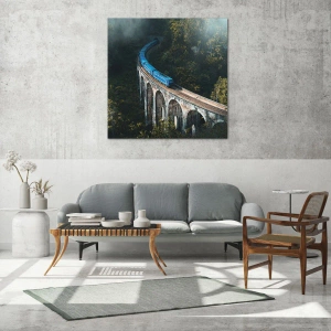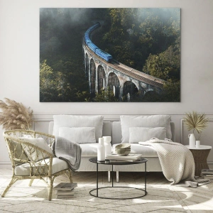 - Egy kék vonat látképe, amint egy régi kőviadukton halad át, sűrű, zöld erdő ölelésében. A ködös fény és a madártávlatból készült kép misztikummal és utazási inspirációval teli képet alkot. Tökéletes dekoráció álmokkal teli enteriőrökbe.