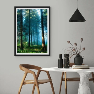 Poszter fehér keretben - Tűlevelű erdő a reggeli napsütésben és könnyű ködben - 50x70cm - Sugárzó reggel - Modern fali dekoráció nappalihoz és hálószobához ARTTOR