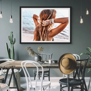 Poszter fehér keretben - Egy nő, hosszú hajjal, kagylókkal díszítve a tengerparton - 50x70cm - A víz és a nap testvére - Modern fali dekoráció nappalihoz és hálószobához ARTTOR