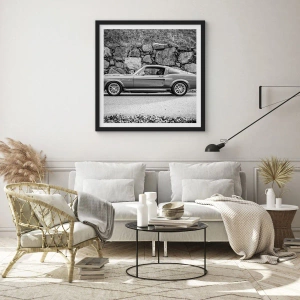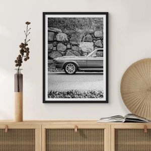 Poszter fehér keretben - Fekete-fehér klasszikus autó egy kőfalnak támaszkodva - 50x70cm - A 60-as évek legendája - Modern fali dekoráció nappalihoz és hálószobához ARTTOR