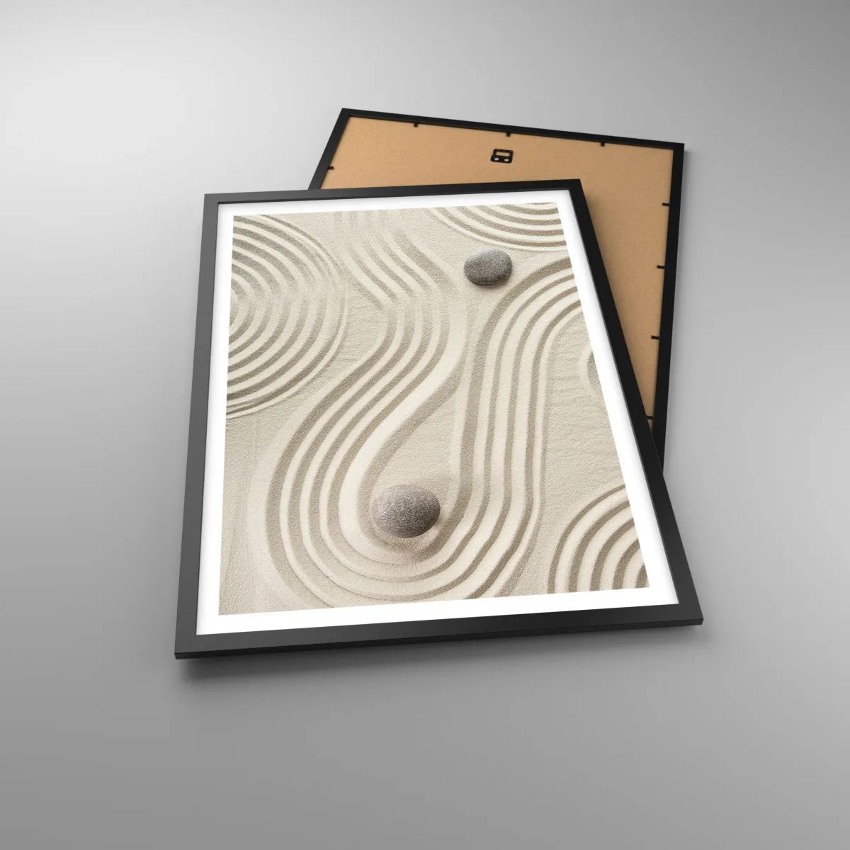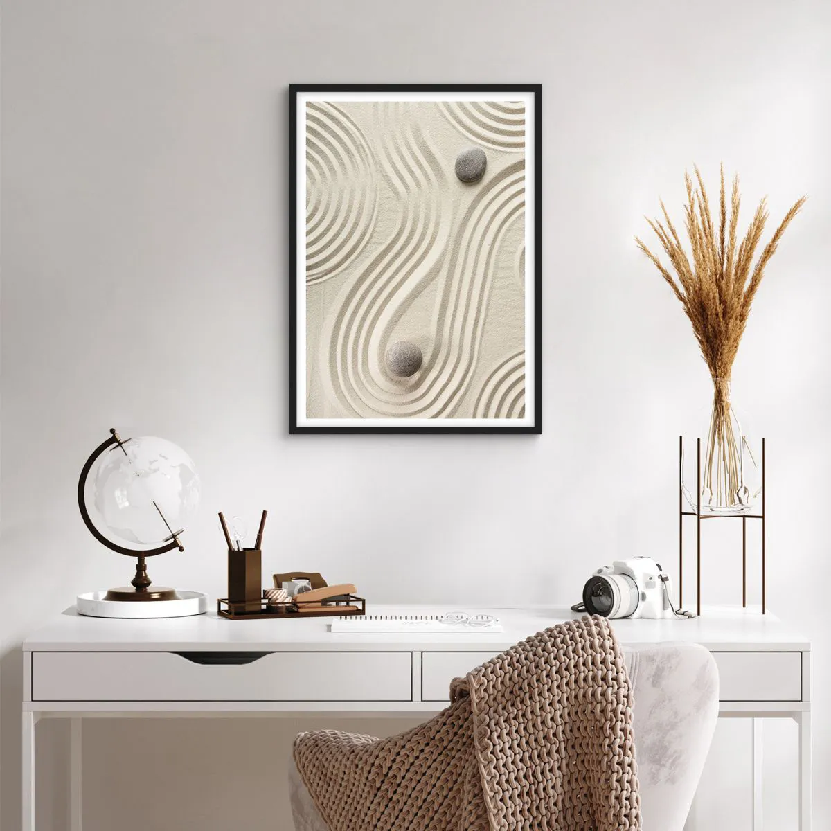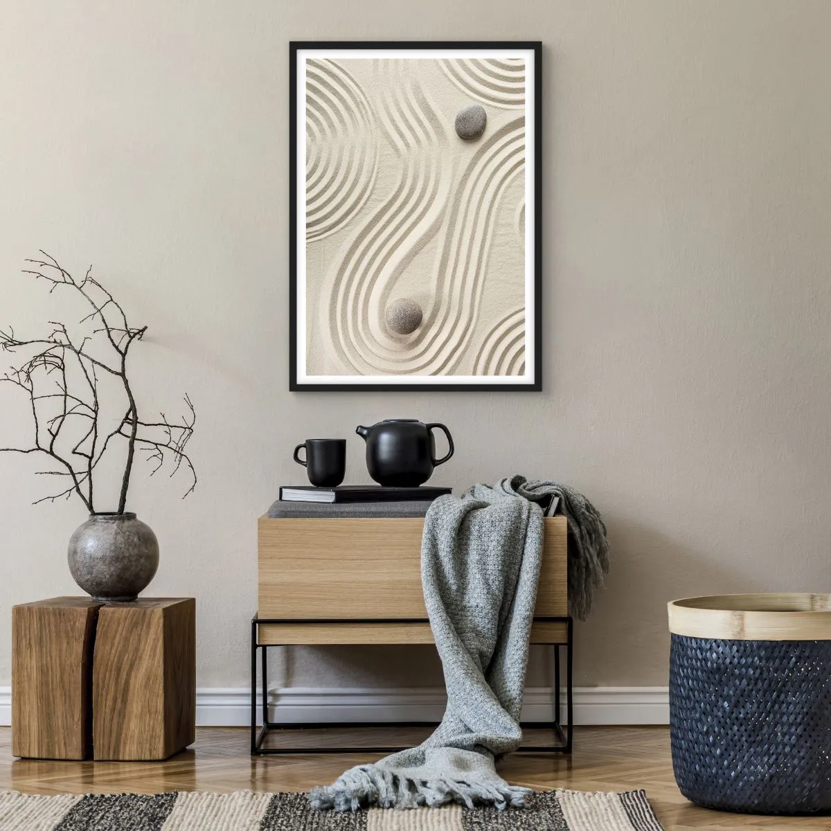 - A poszter minimalista kompozícióját egy japán zen kert ihlette, ahol a homok harmonikus vonalai veszik körül a köveket. A finom esztétika békét és egyensúlyt visz a belső térbe.