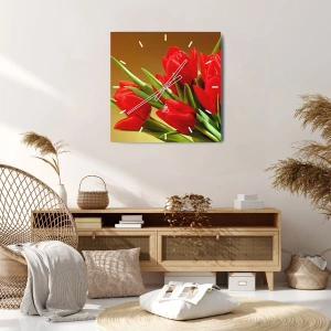 Falióra, Óra - Egy csokor piros tulipán arany alapon - 30x30cm - Egy csokor tavaszi öröm - Modern fali dekoráció nappalihoz, konyhához és hálószobához ARTTOR