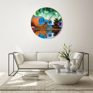 A "{title_spa}" egy egyedi falióra, amely a relaxáció és a harmónia légkörébe repít minket. A motívum egy wellness kompozíciót ábrázol kövekkel, törölközővel és gyertyával, festői természeti háttér előtt. Ez a művészi minta békét és esztétikát visz a belső térbe, tökéletesen kiegészítve a zen ihlette tereket.