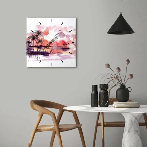 Falióra, Óra - Akvarell tájkép pálmafákkal naplementekor - 30x30cm - A trópusok nyugalma vörösben - Modern fali dekoráció nappalihoz, konyhához és hálószobához ARTTOR