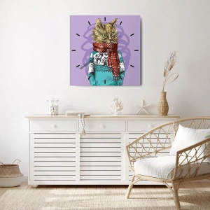 Falióra, Óra - Egy macska téli ruhában, sállal, lila háttér előtt - 30x30cm - Kandúr nem csak a csizmában - Modern fali dekoráció nappalihoz, konyhához és hálószobához ARTTOR
