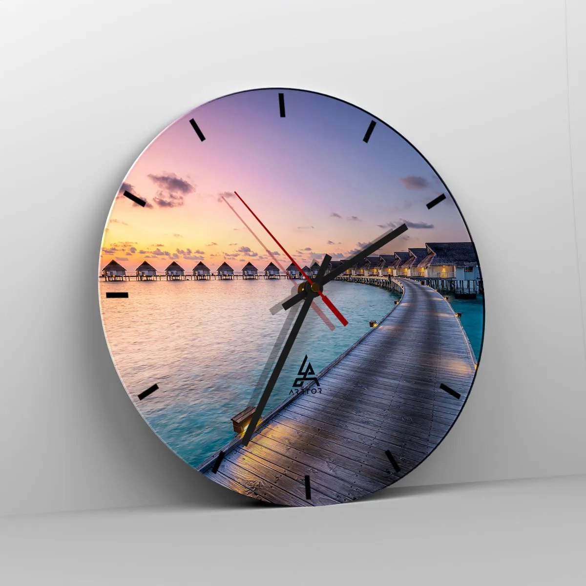 Ez a falióra nemcsak praktikus bútordarab, hanem egyedi dekoráció is, amely magára vonzza a tekintetet, és egy trópusi tengerpartra repít minket. A lenyugvó nap hátterében álló bungalók motívuma tele van pihenéssel és egzotikummal, így tökéletes választás azok számára, akik értékelik a természet szépségét és a trópusi éghajlatot.