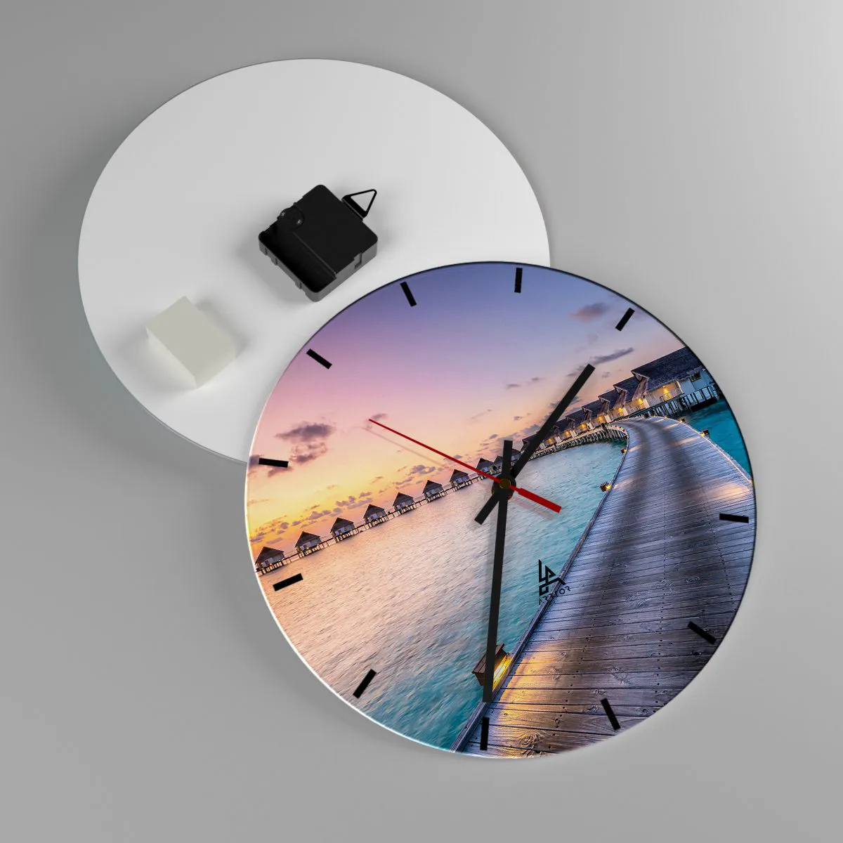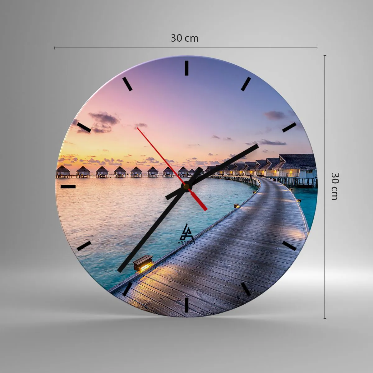 Falióra, Óra - Egy ösvény a tengerparton, bungalók a lenyugvó nap hátterében - 30x30cm - Nyaralás – vissza a forrásokhoz - Modern fali dekoráció nappalihoz, konyhához és hálószobához ARTTOR