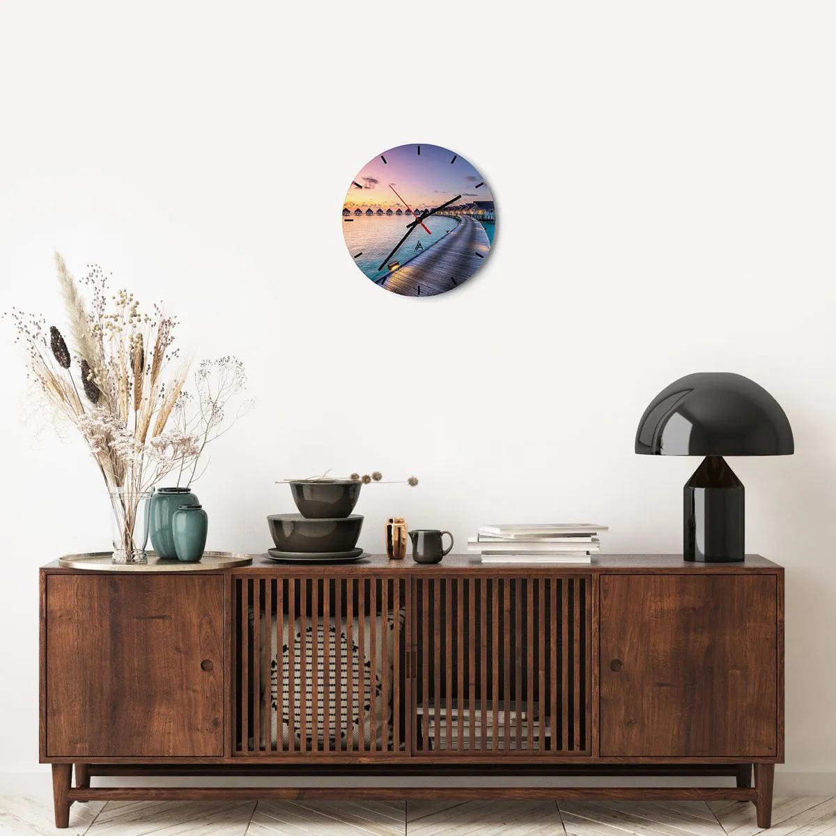 - Ez a falióra egy trópusi utat ábrázol, amely bungalókhoz vezet, a háttérben a lenyugvó nap látható. Tökéletes nyári, trópusi, modern stílusú enteriőrökbe.