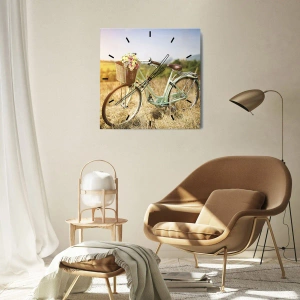 Falióra, Óra - Egy bicikli virágokkal teli kosárral egy mezőn, egy napsütéses napon - 30x30cm - Itt maradok egy darabig - Modern fali dekoráció nappalihoz, konyhához és hálószobához ARTTOR