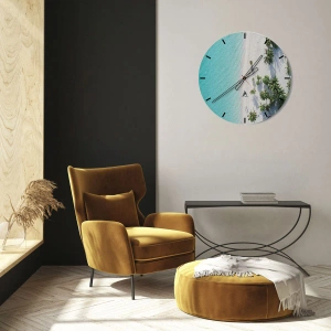 - Ez az óra egy egzotikus tengerpart felülnézetét ábrázolja türkizkék vízzel és pálmafákkal. Az óra kerek formája tökéletes a nyaralási tájképek szerelmeseinek, mivel számos enteriőrhöz illik.