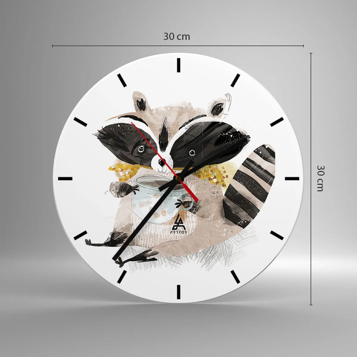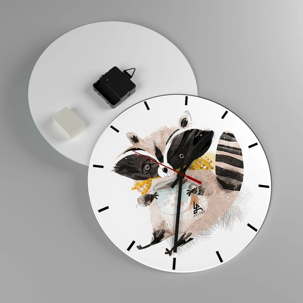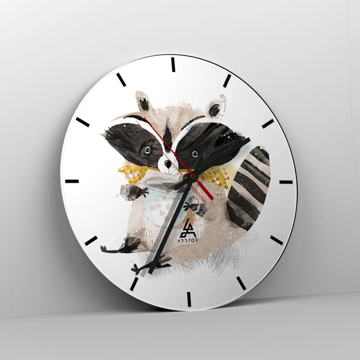 Az üvegórát az ARTTOR tervezte, és 30x30 cm-es formátumban készült. Az üvegfelület eleganciát kölcsönöz, miközben kiemeli az illusztrációk élénk színeit és minőségét. A precíz nyomtatásnak köszönhetően minden részlet – a mosómedve bundájától a bögre mintáiig – tökéletesen látható.