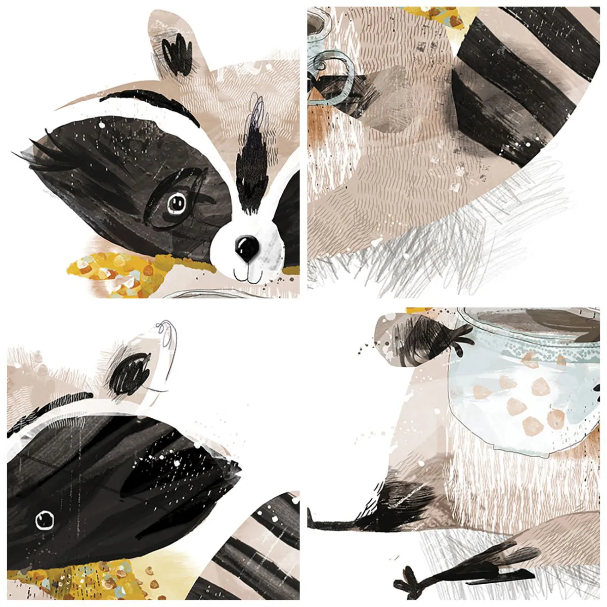 Az illusztráció finom, pasztellszínekben készült, így az egésznek lágy és visszafogott hangulatot kölcsönöz. Az állat barátságos sziluettje jól kiemelkedik a fehér háttérből, és az olyan részletek, mint a csíkos farok, a nagy fülek és a puha mancsok hangsúlyozzák a kompozíció gyermeki jellegét.