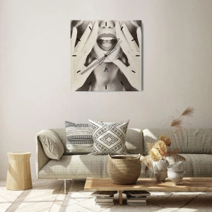 Falióra, Óra - Művészi szépia felvétel egy női szájról és kezekről - 30x30cm - Jövök már! - Modern fali dekoráció nappalihoz, konyhához és hálószobához ARTTOR