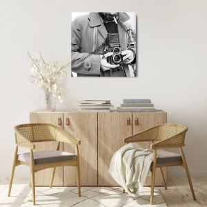 Az órán látható kép részleteivel vonzza a figyelmet – a kabát anyagának textúrája, a kifejező keret és a kamera tökéletesen reprodukált részletei. A kompozíció a letűnt idők hangulatát idézi, miközben egy csipetnyi modern minimalizmust is hoz a belső térbe. Ideális ajánlat azok számára, akik értékelik a klasszikus és a modern kombinációját, és azoknak, akiknek a fotózás több, mint hobbi.