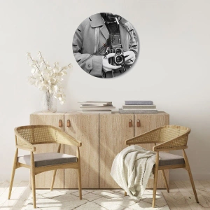 A "Retro stílusú" falióra a lakberendezés művészi megközelítését testesíti meg, amelyet a retro stílus és a fotózás iránti szenvedély ihletett. Számlapján egy fekete-fehér fotó látható egy férfiról, aki klasszikus analóg kamerát tart a kezében. Az összkép visszafogott, monokróm színekben pompázik, amelyek tökéletesen hangsúlyozzák a fotó jellegét, és időtlen stílust kölcsönöznek az egész darabnak.