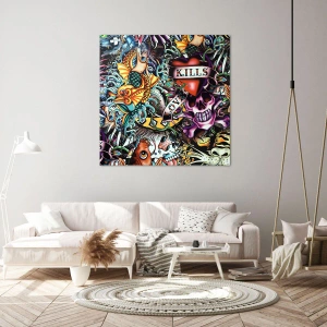 - festmény intenzíven színes, tetoválás stílusú grafikákat tartalmaz, tele koponyákkal, tengerészeti motívumokkal és részletes grafikával. Az élénk színek és a művészi kompozíció dinamikus hangsúlyt hoz létre, amely tökéletesen kiegészíti a modern belső ...
