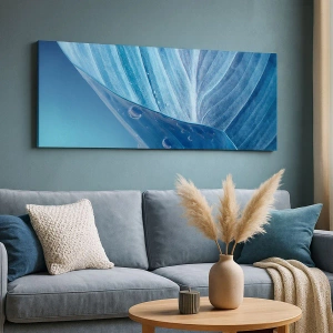 - Ez a festmény egy vízcseppekkel díszített kék levél részleteit ábrázolja. Elegáns és minimalista dekoráció, amely természetes szépséget és nyugalmat visz bármilyen enteriőrbe.