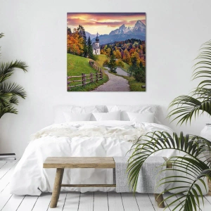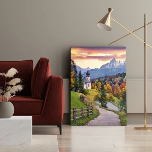 Falfestmény - Tájkép, mint egy festmény - Őszi hegyi táj kápolnával és naplementével