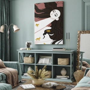 - A festmény egy csukott szemű alakot ábrázol, akit aranyló lovak vesznek körül, világos háttér előtt pihen, finom barna hajjal ölelve körül. Az összhatás a kortárs művészetre emlékeztet, megragadva a természeti motívumok harmóniáját és finomságát.