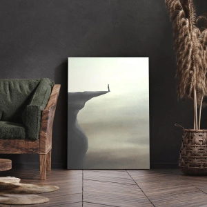 - Egy szikla szélén álló alak sziluettje, ködös háttérrel körülvéve, titokzatos és minimalista tájképet teremt. Ez a mű finomságával és nyugalmával rabul ejti a látogatót, tökéletesen kiegészítve a modern enteriőröket.
