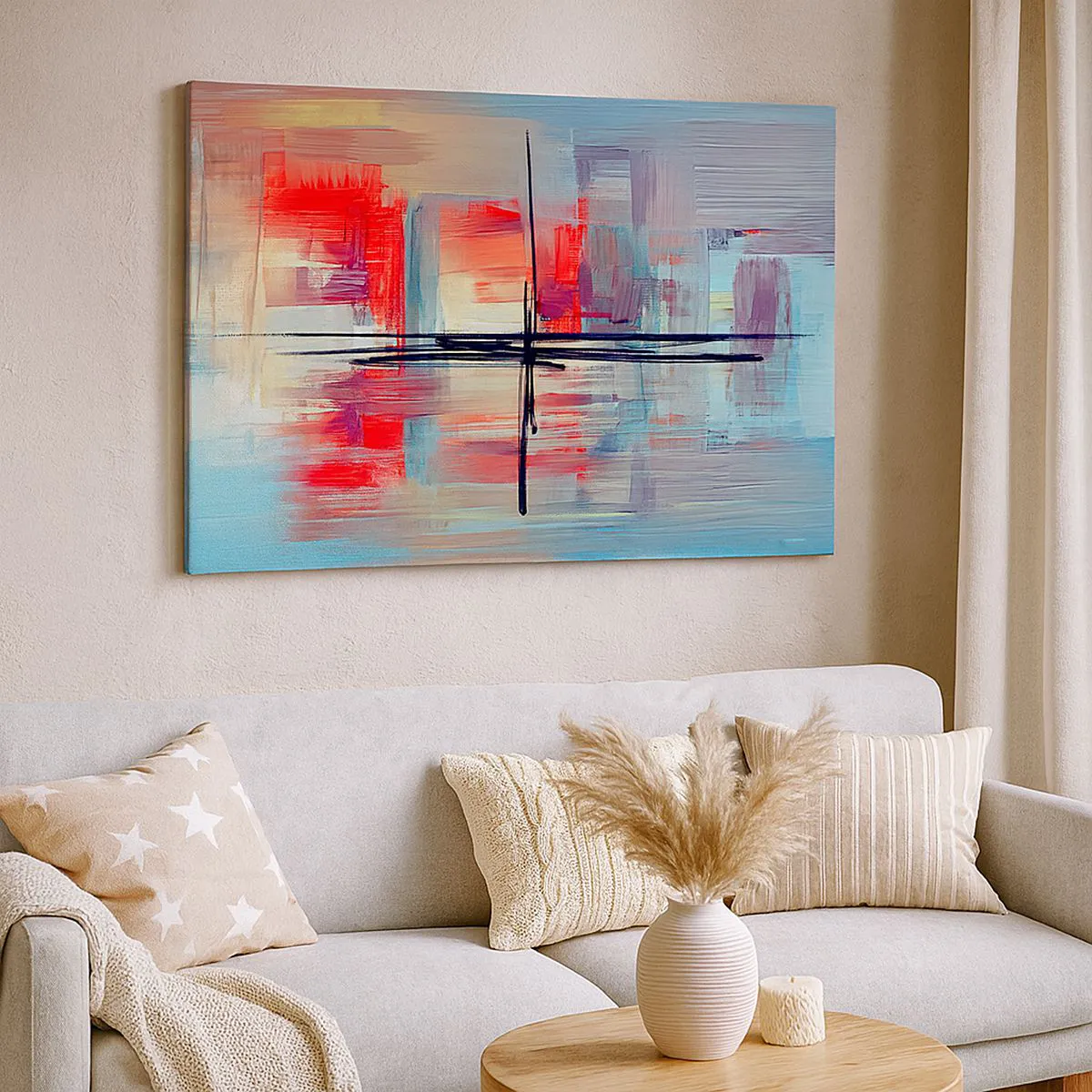 Az "Tájkép ismeretlen dimenzióban" festmény egy egyedi absztrakt művészeti alkotás, amely intenzív színeivel és dinamikus vonalaival vonzza a tekintetet. A domináns vörös, kék és bézs árnyalatok harmonikusan keverednek, mozgás és mélység érzetét keltve. A geometriai formák és a kontrasztos vonalak modern karaktert kölcsönöznek a kompozíciónak.